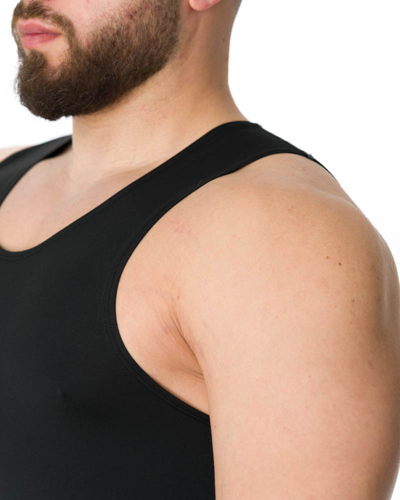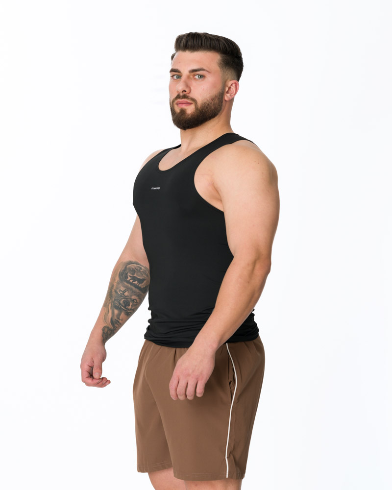 Spate racer back = umeri liberi la tracțiuni, împins sau ridicări. Cusături forward shoulder + tiv drept = look curat și modern. Lungime ușor mai mare = nu se ridică niciodată, chiar și la burpees sau alergare.