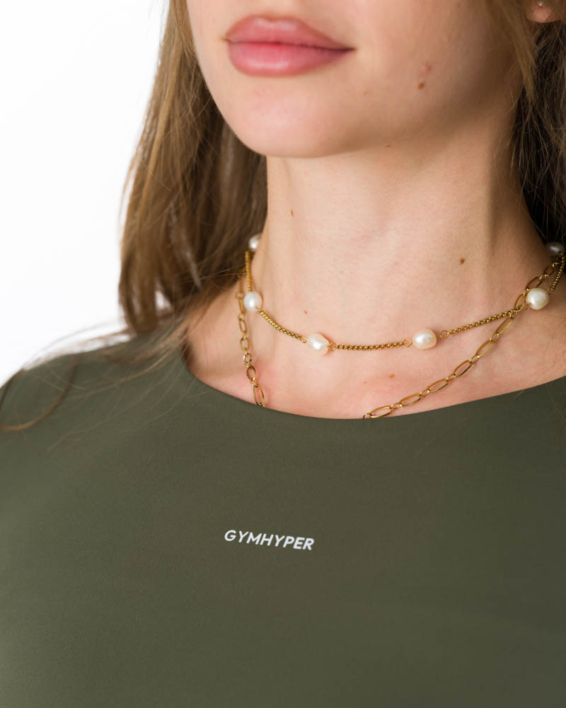 Materialul cu elasticitate crescută asigură libertate totală de mișcare, fiind ideal pentru antrenamente de forță, yoga, pilates sau sesiuni dinamice. Logo-ul GymHyper imprimat completează look-ul premium al acestui Top fitness Ixchel Olive și garantează atenția la detalii.
